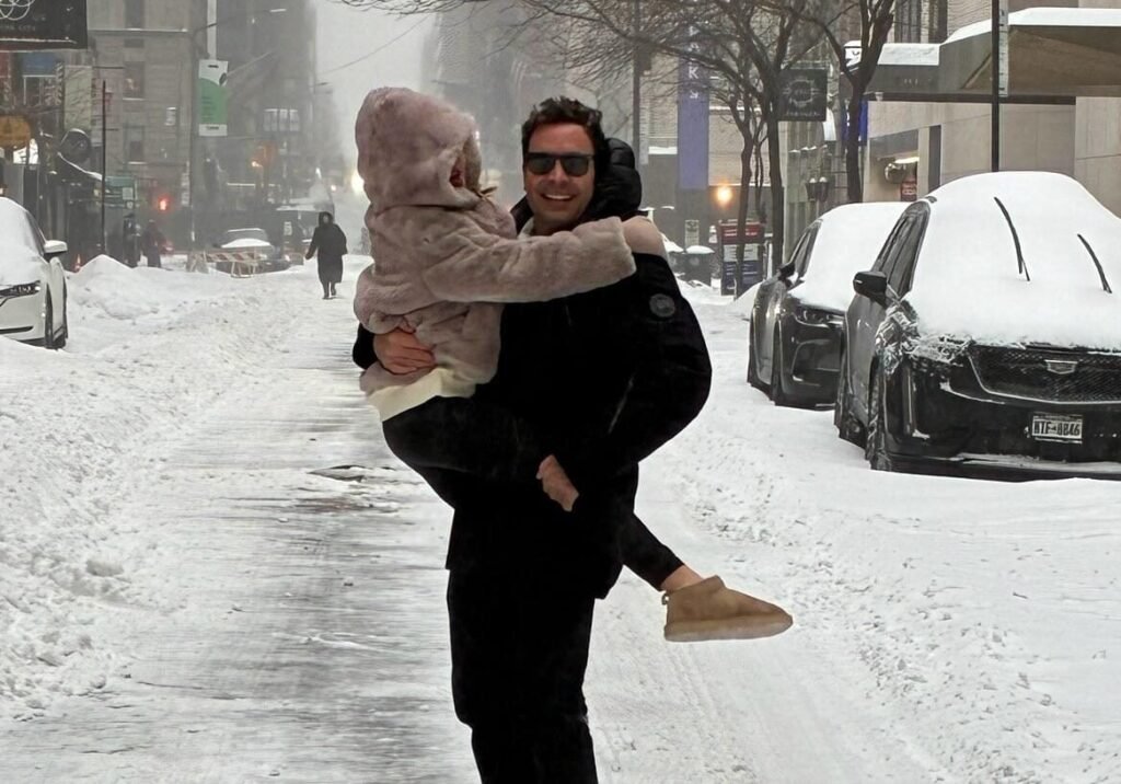 The image shows Jimmy Fallon and his young daughter bundled up, seemingly mid-adventure in a snowy landscape. The commenters found her expression because it showed both happiness and discomfort from the cold weather. The man who usually appears on television to conduct celebrity interviews showed his genuine self through this typical fatherhood behavior which connected with viewers.