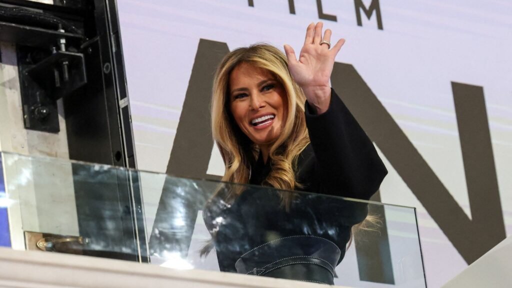 Melania Trump waves as her film is promoted at the New York Stock Exchange. Pic: Reuters