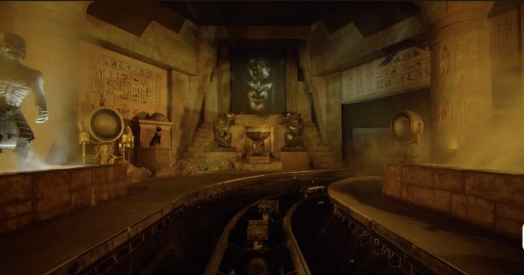 The enclosed roller-coaster sends riders hurtling through the dark corridors of a haunted tomb in mine carts. One notable segment features the riders’ mine cart plunging nearly 40 feet as they are surrounded by mummified warriors on all sides.